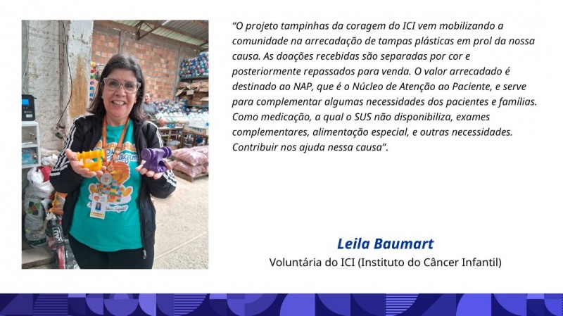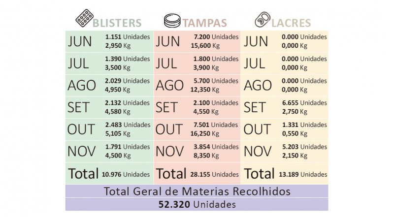 Os blisters de alumínio são doados para a Cooperativa Paz e Bem, de Caxias do Sul, as tampas plásticas vão para o Instituto do Câncer Infantil (ICI) e os lacres de latas (também de alumínio) recebem encaminhamento para a Associação Cristã de Moços do Rio Grande do Sul (ACM-RS), as duas últimas em Porto Alegre.